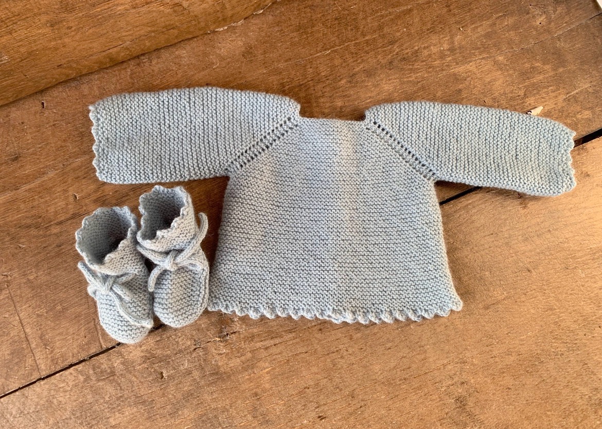 Está tejido en lana muy fina y es ideal para los primeros meses. Hemos diseñado también están los patucos a juego para que completes el conjunto.
